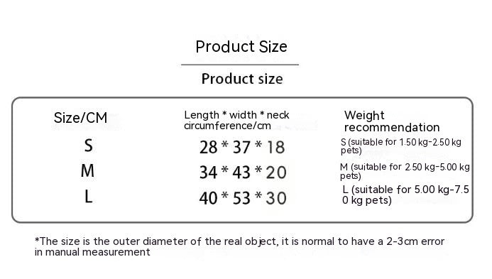 Size: S (suitable for 1.50kg-2.50kg pets),M (suitable for 2.50kg-5.00kg pets),L (suitable for 5.00kg-7.50kg pets)